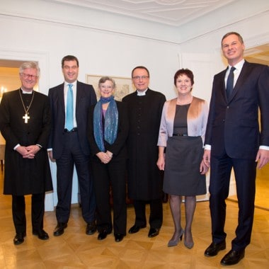 Begrüßung in den Salons des Schlosses: Landesbischof Heinrich Bedford-Strohm, Staatsminister Markus Söder, Deborah Bedford-Strohm, Akademiedirektor Udo Hahn sowie die stellv. Akademiedirektorin Ulrike Haerendel und Festredner Georg Mascolo (v.l.)