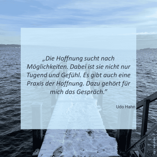 Akademiedirektor Udo Hahn nutzte diese Gedanken und Formulierungen des Theologen Jürgen Moltmann in seiner Dankesrede im Februar 2025. Anlass war die Auszeichnung und Ehrung Udo Hahns mit dem “Freundeskreiszeichen” des Freundeskreises der Evangelischen Akademie Tutzing für 40 Jahre Bildungsengagement.