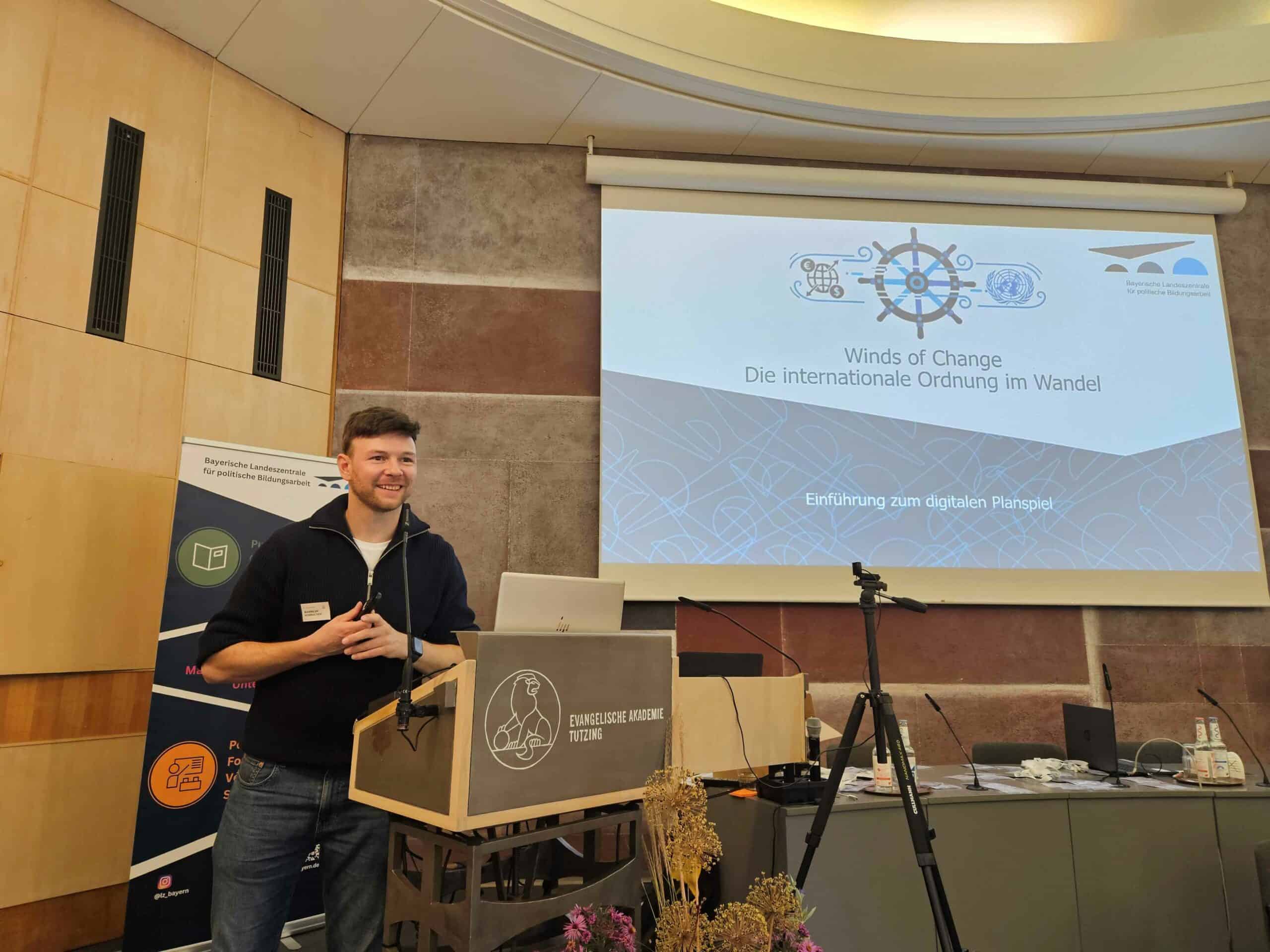 Highlight der Tagung war für viele Tagungsgäste das Planspiel zu den United Nations (UN) mit dem Namen “Winds of Change”. Maximilian Nominacher von der Landeszentrale hatte es maßgeblich mit entwickelt und leitete das digitalbasierte Spiel an. Jeder Tagungsgast spielte eine Persona, wie zum Beispiel den brasilianischen Außenminister Mauro Vieira, den US-Präsidenten Trump oder den deutschen Bundeskanzler Merz. Somit agierte jede:r in seiner politischen und länderspezifischen Rolle im international simulierten Planspiel. Was zunächst wie ein Computerspiel wirkte, entpuppte sich schnell als knallharte Lektion in Realpolitik. So versuchte zum Beispiel das Spielteam in der Rolle Polens, verbesserte Bildung und Wirtschaftswachstum zu vereinbaren. Gleichzeitig kurbelte im Spiel aber das Team China mit Maßnahmen auf Kosten der Umwelt die Industrie an. Die digitale Plattform des Spiels zeigte in Echtzeit, wie sich jede Entscheidung auf andere Länder auswirkte. Gerade die Vorgabe, die Rollen realistisch und nicht utopisch oder gar bewusst optimistisch zu spielen, gaben viele Tagungsgäste in der Evaluation als herausfordernd an. Das Planspiel war damit ein Realitätscheck für alle, die glauben, Politik sei einfach.
