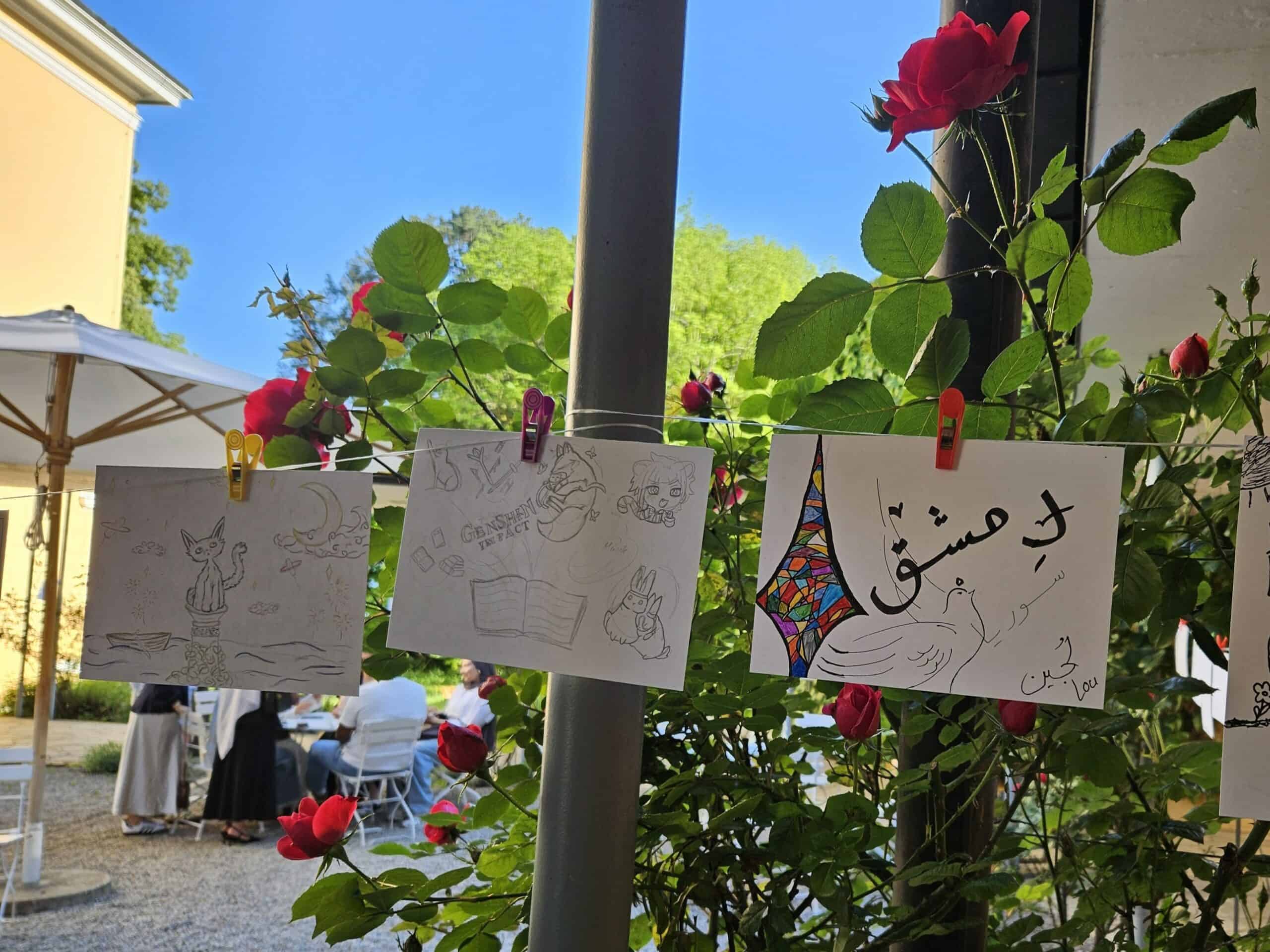 Bild: Zeichnungen der jungen Tagungsteilnehmenden im Rosenatrium der Akademie